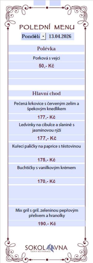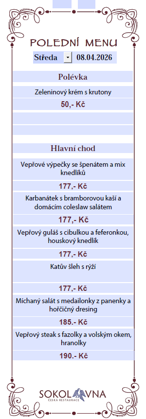 Vítejte s nově zrekonstruované a otevřené restauraci Sokolovna. Kromě příjemného personálu se u nás můžete těšit na výborná jídla nejen z české kuchyně a také na pivo Staropramen. Kapacita restaurace je 79 míst k pohodlnému posezení uvnitř a 50 míst na venkovní zahrádce.